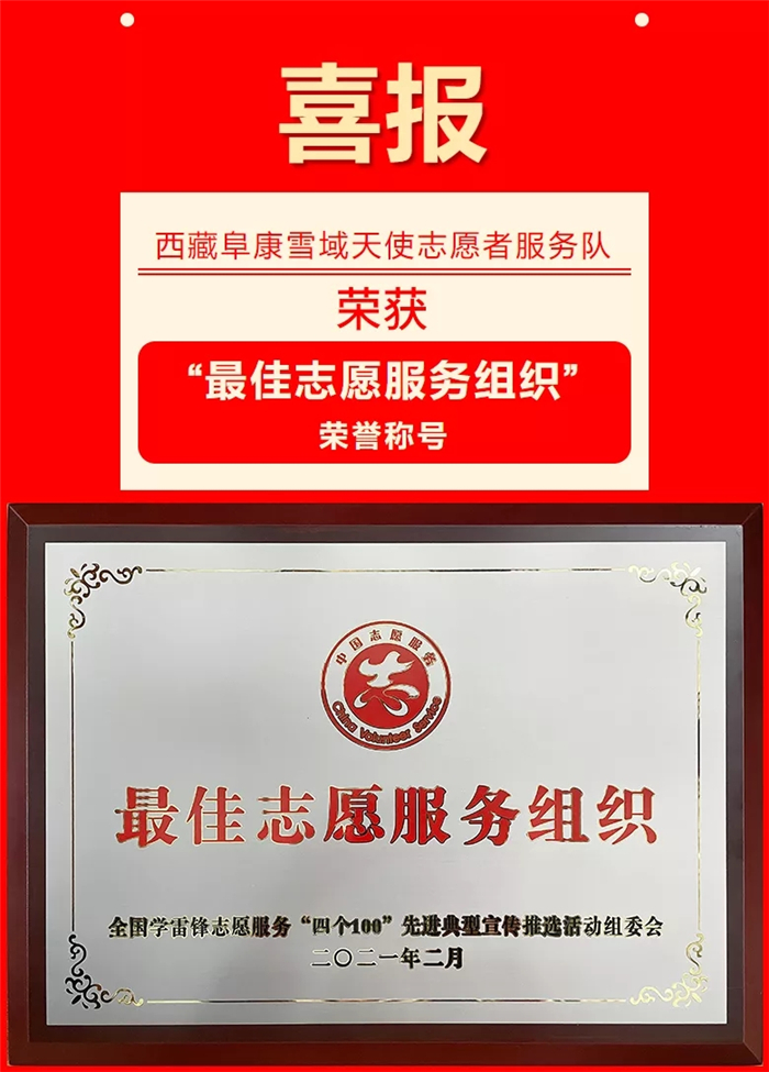 在2020年度全國學(xué)雷鋒志愿服務(wù)"四個(gè)100”先進(jìn)典型宣傳推選活動中,西藏阜康雪域天使志愿者服務(wù)隊(duì)榮獲"最佳志愿服務(wù)組織”榮譽(yù)稱號。